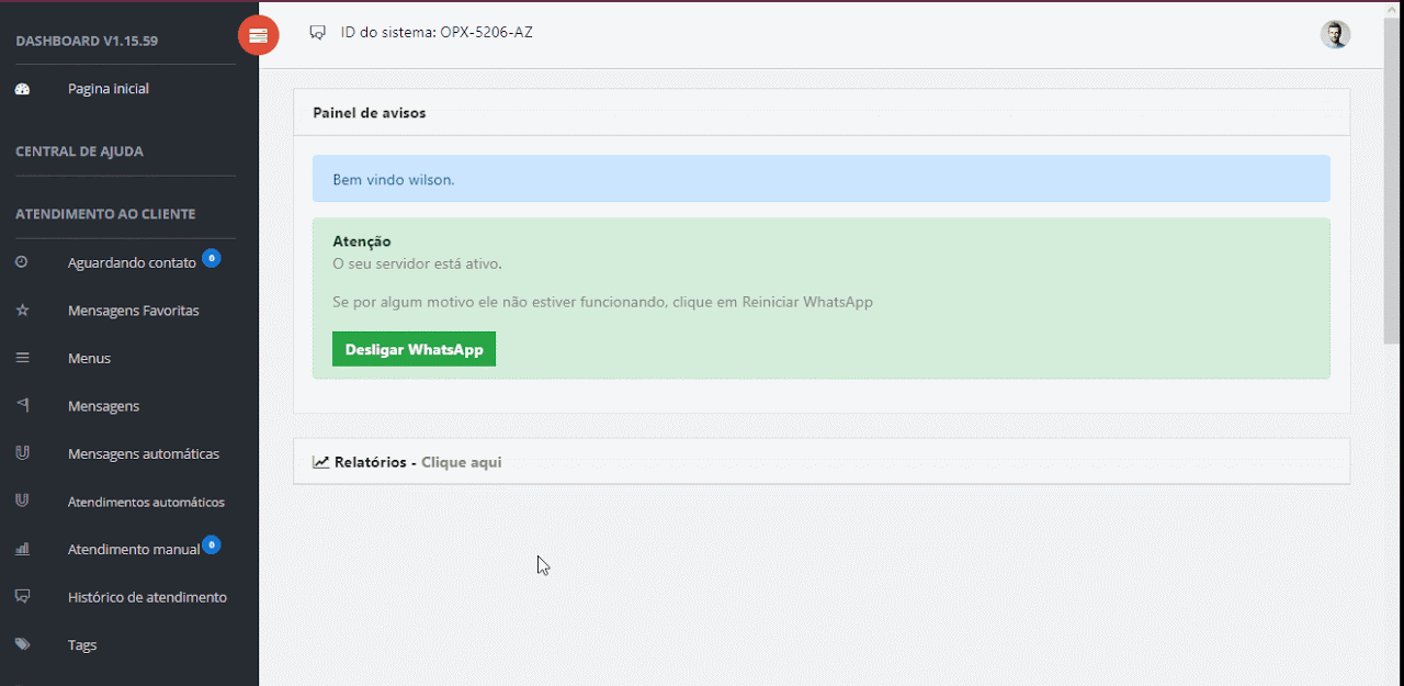 2 - Financeiro" (ao selecionar essa opção será redirecionado para a mensagem com o nome de "financeiro" anteriormente configurada no menu "mensagens".