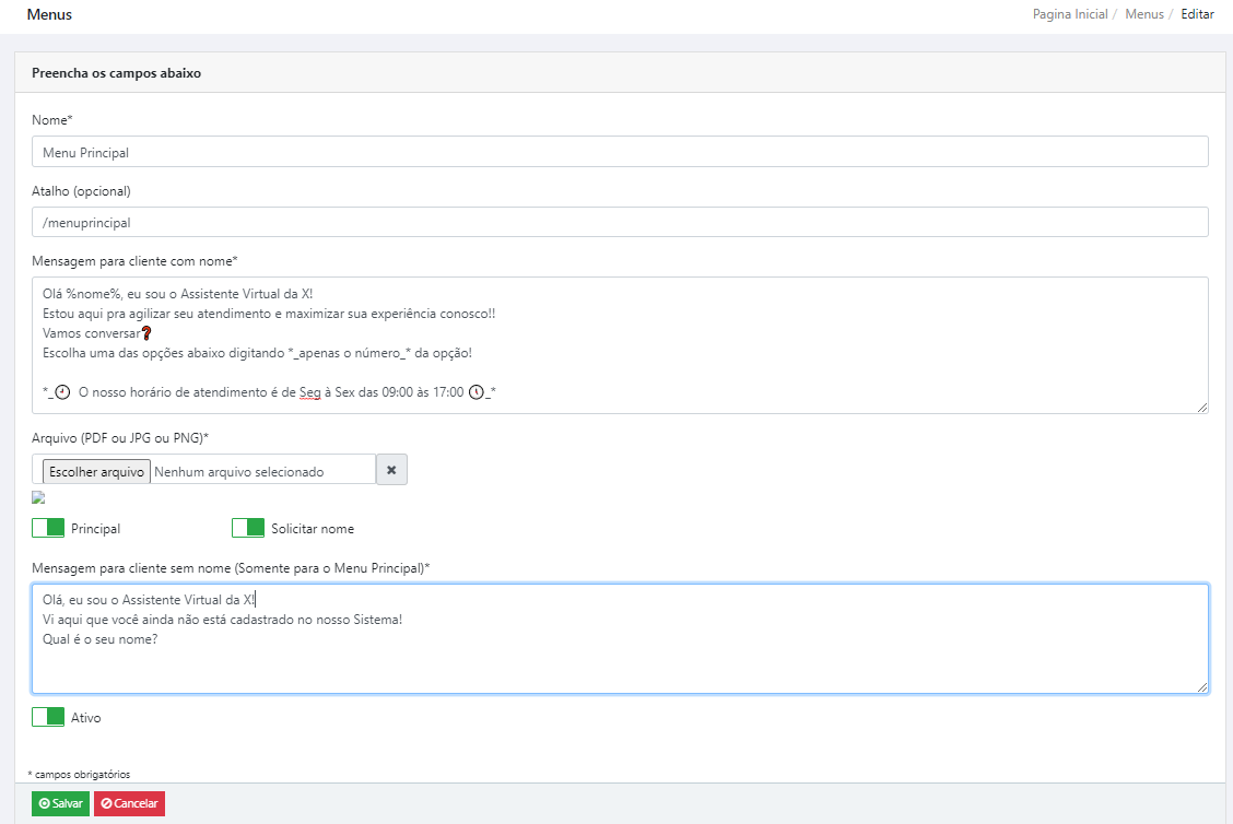 Principal: Será o menu que aparecerá para o cliente quando o mesmo entrar em contato.